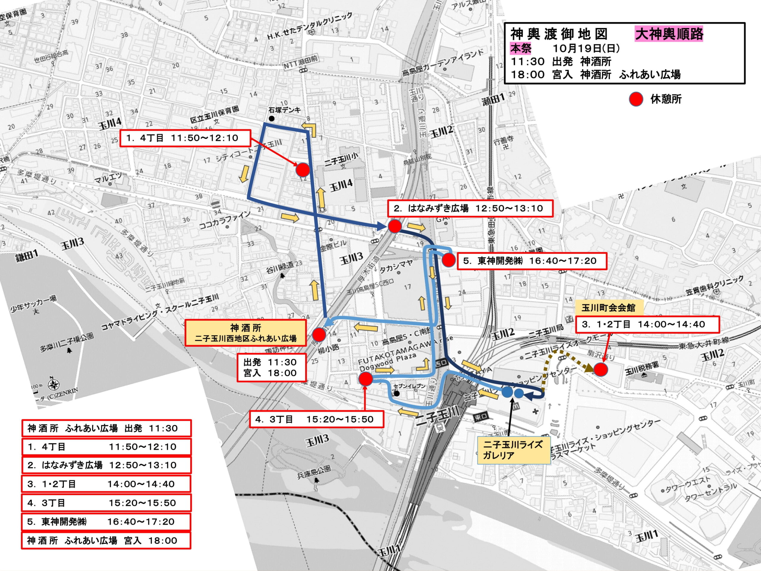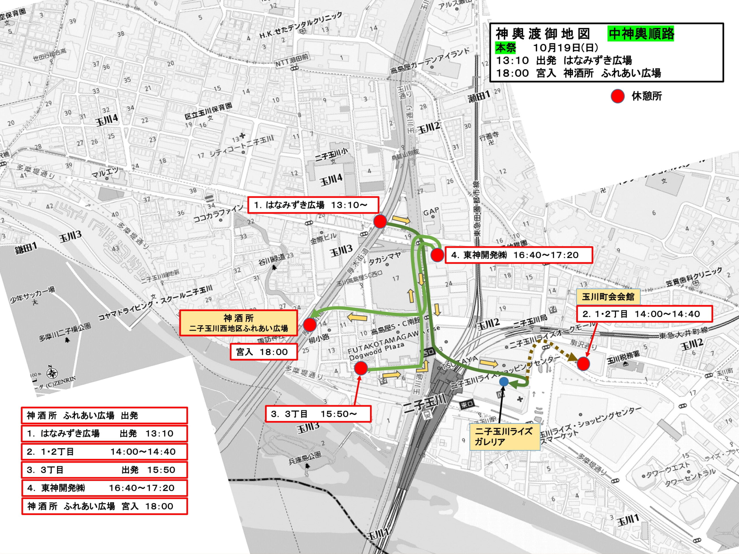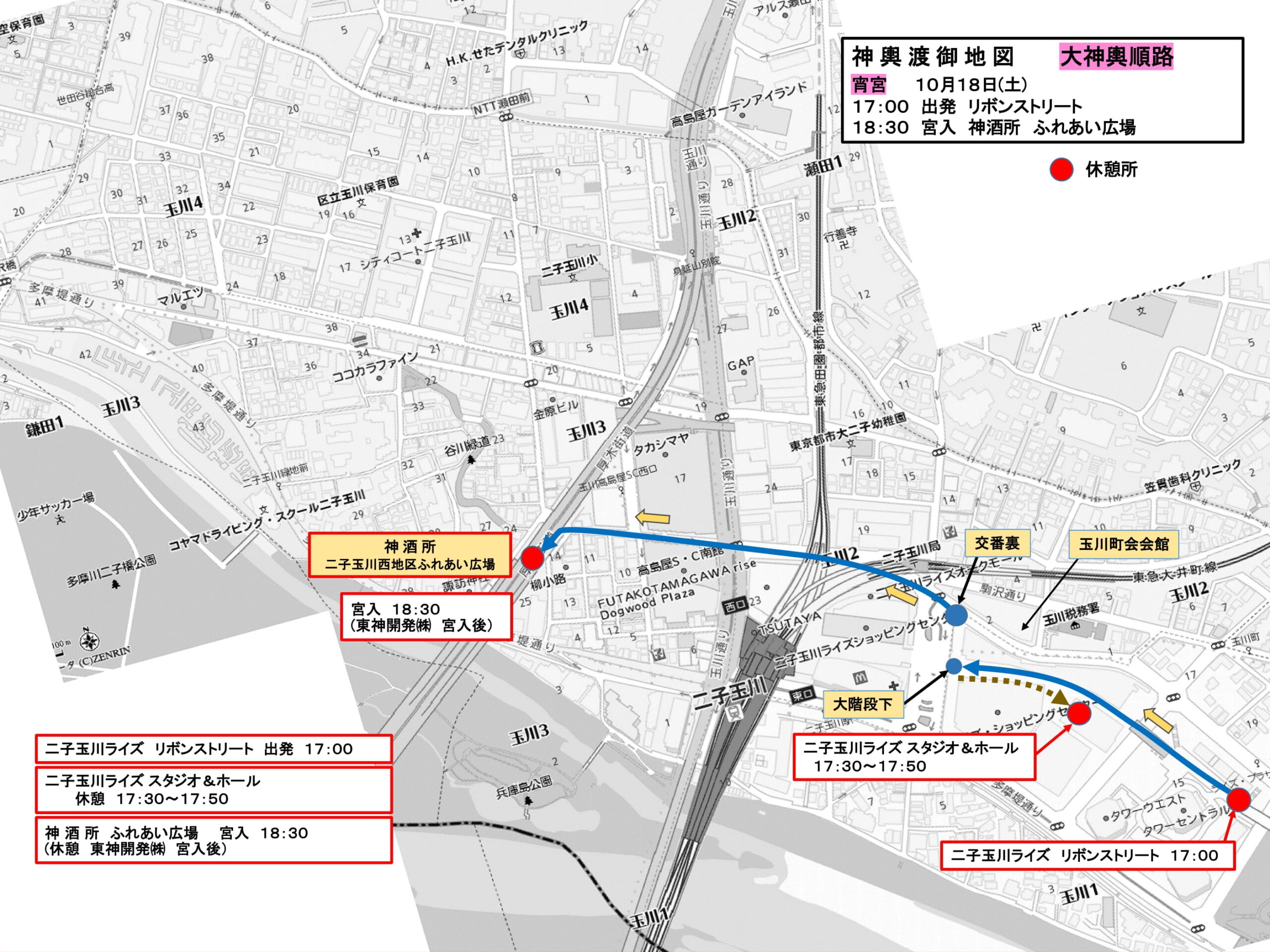 午後5時 二子玉川ライズリボンストリート出発、午後6時30分 神酒所入り(玉川一丁目・二子玉川ライズ内、二子玉川公園通りを渡御)