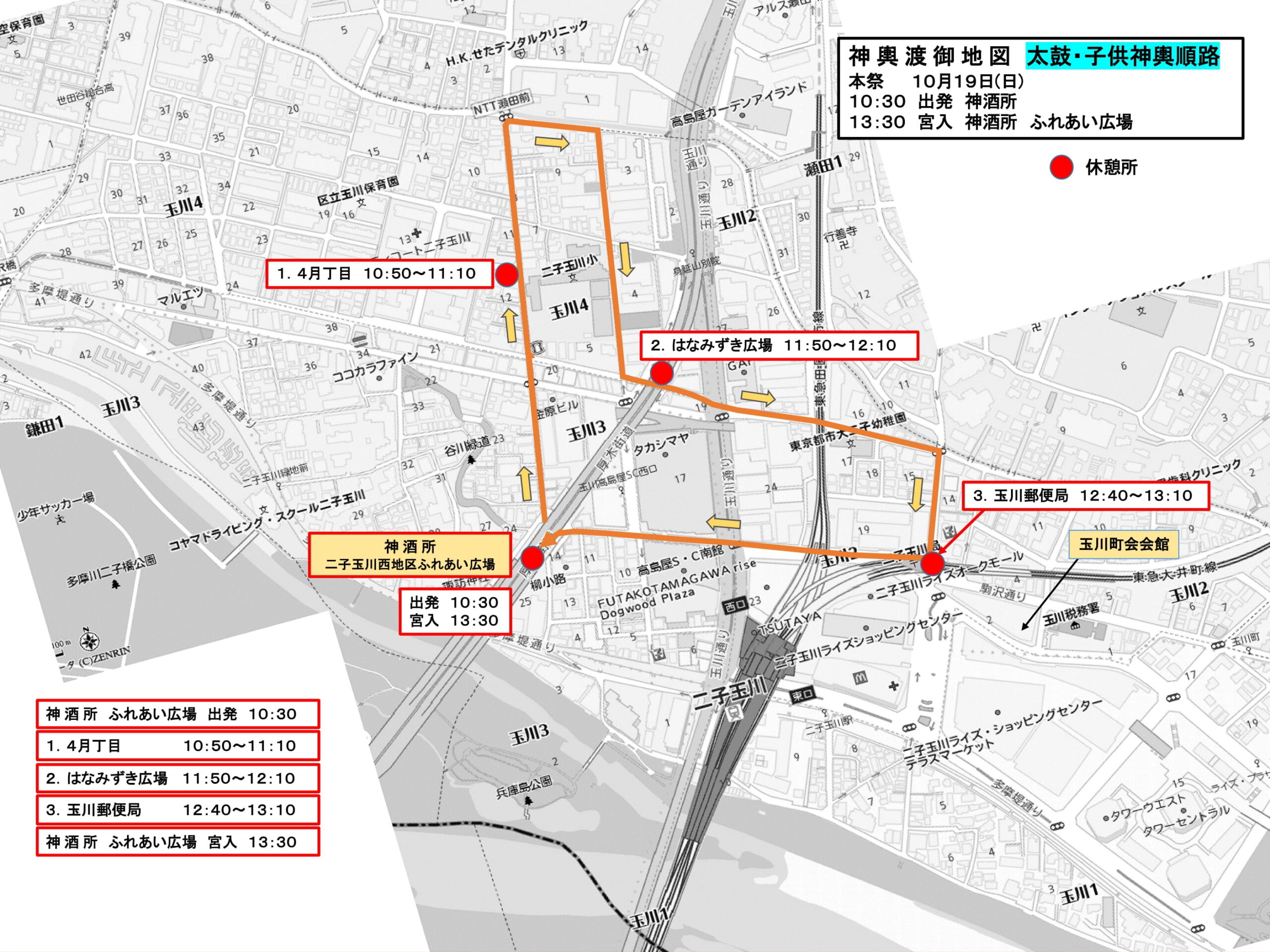 午前11時30分 神酒所出発、午後6時 神酒所入り(玉川町内、246 号線を渡御) - 中神輿